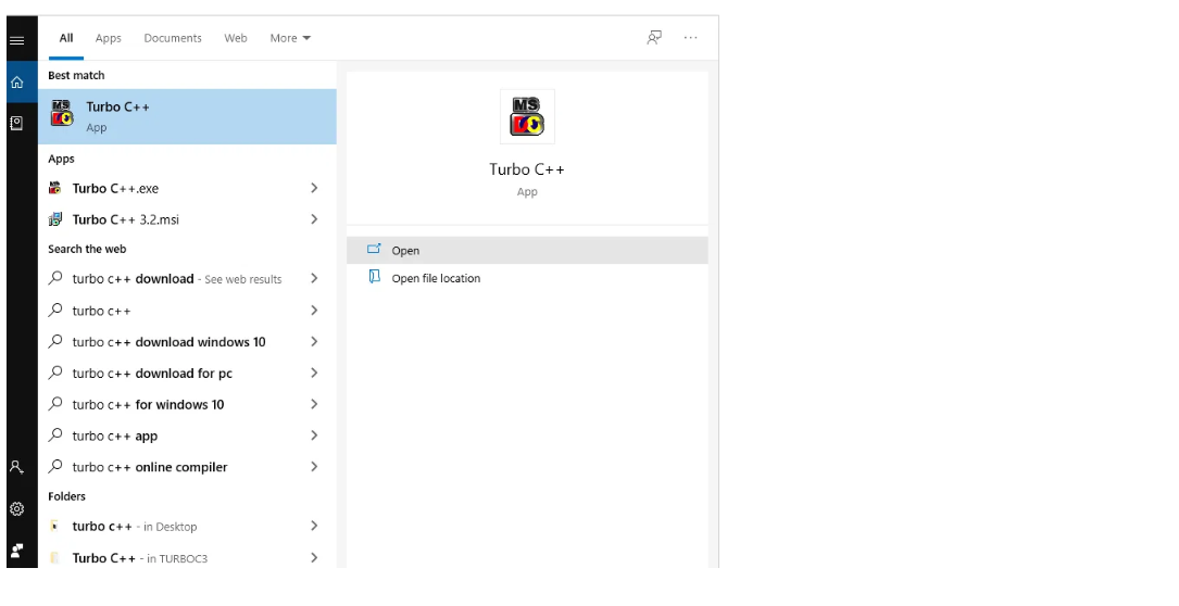 To start the IDE, you can either create a shortcut on your desktop to easily start the IDE every time. Or open the Start menu, and search for Turbo C and you will the application there.