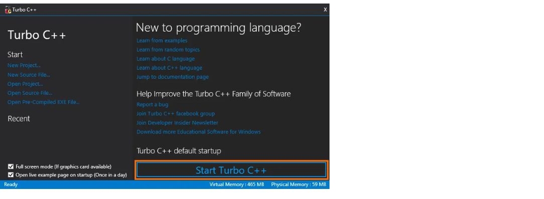 Click on the Turbo C++ app option and you will see the following Window. Then click on the Start Turbo C++ button to launch the IDE application.