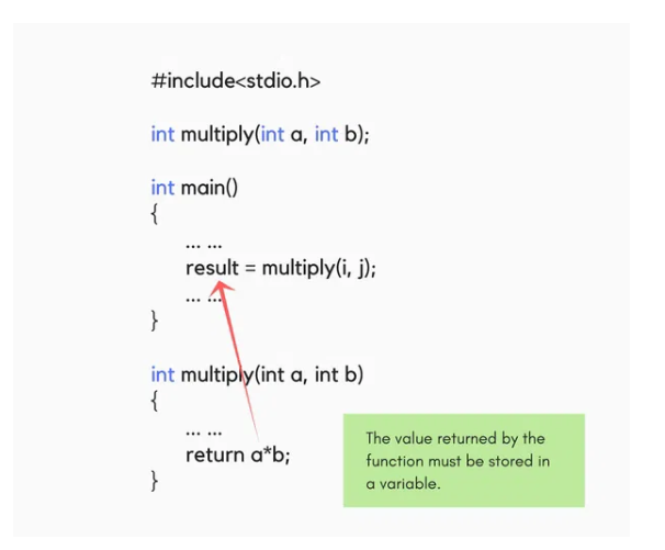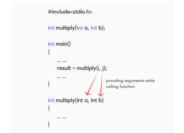 In the example above, the statement multiply(i, j); inside the main() function is function call.