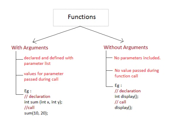 While declaring the function, we have declared two parameters a and b of type int. Therefore, while calling that function, we need to pass two arguments, else we will get compilation error. And the two arguments passed should be received in the function definition, which means that the function header in the function definition should have the two parameters to hold the argument values. These received arguments are also known as formal parameters. The name of the variables while declaring, calling and defining a function can be different.