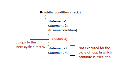 It causes the control to go directly to the test-condition and then continue the loop execution. On encountering continue, the execution leaves the current cycle of loop, and starts with the next cycle.