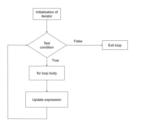 We first initialize our iterator. Then we check the condition of the loop. If it is false, we exit the loop and if it is true, we enter the loop. After entering the loop, we execute the statements inside the for loop, update the iterator and then again check the condition. We do the same thing unless the test condition returns false.