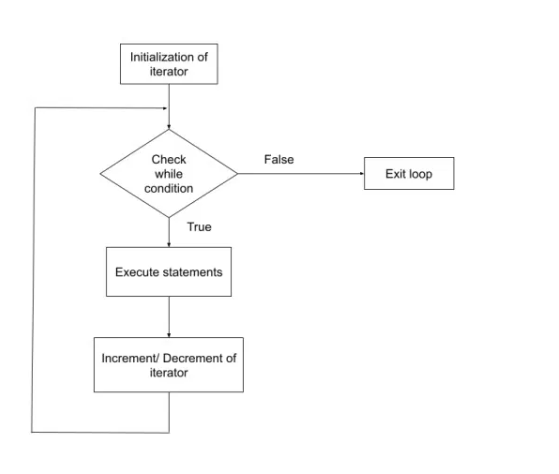 Here, we can see that firstly, we initialize our iterator. Then we check the condition of while loop. If it is false, we exit the loop and if it is true, we enter the loop. After entering the loop, we execute the statements inside the while loop, update the iterator and then again check the condition. We do the same thing unless the condition is false.