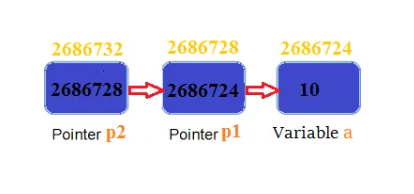 p1pointer variable can only hold the address of the variablea(i.e Number of indirection operator(*)-1 variable). Similarly,p2variable can only hold the address of variablep1. It cannot hold the address of variablea.*p2gives us the value at an address stored by thep2pointer.p2stores the address ofp1pointer and value at the address ofp1is the address of variablea. Thus,*p2prints address ofa.**p2can be read as*(*p2). Hence, it gives us the value stored at the address*p2. From above statement, you know*p2means the address of variable a. Hence, the value at the address*p2is 10. Thus,**p2prints10.