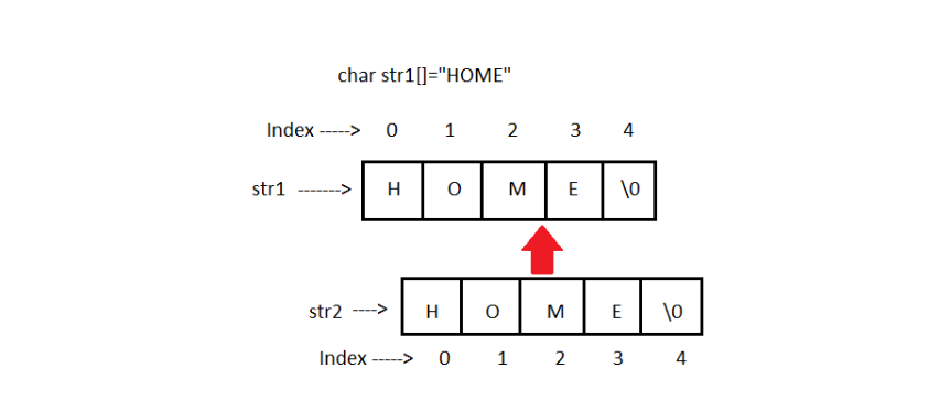 For example: The string "home" contains 5 characters including the '\0' character which is automatically added by the compiler at the end of the string.