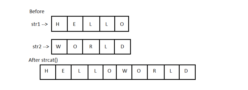 strcat("hello", "world");strcat() will add the string "world" to "hello" i.e ouput = helloworld.