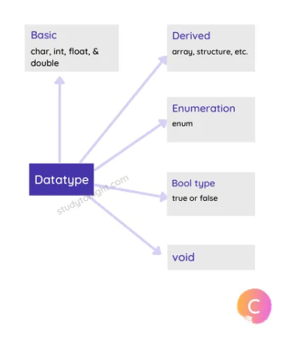 Broadly, there are 5 different categories of data types in the C language, they are: