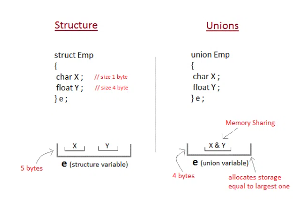 We can see that the size of structure is greater than the sum of size of its members while the size of union is equal to the size of its largest member. This is why there is a difference in the size of structure and union with exactly the same data members. Union members share memory while structure members have their own unique memory.