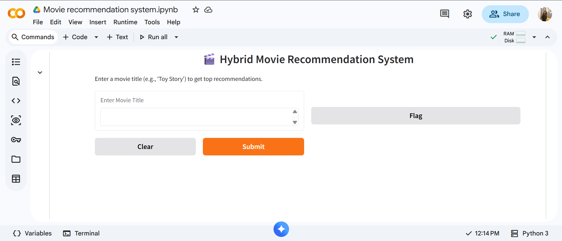 The system takes a movie title as input from the user. This title is searched within the dataset and used to identify similar movies.