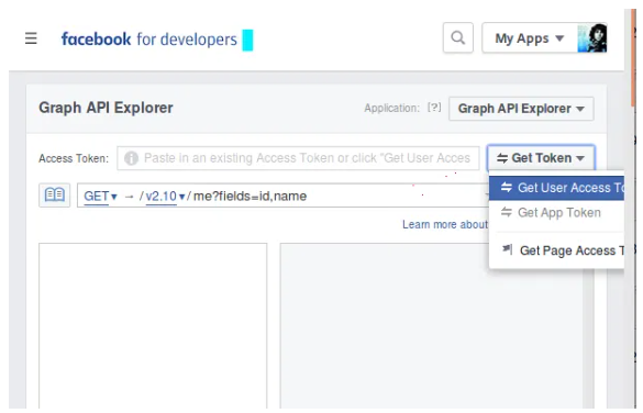 App IDis generated visit https://developers.facebook.com/tools/explorer/Now, click on Get Token → Get User Access Token. If you have multiple apps than you might need to select for which app you want to generate the token.