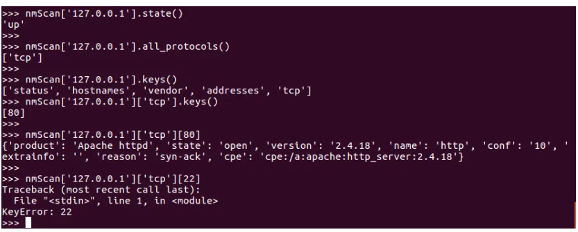**Note:**In last command an error is raised. This is because in command nmScan['127.0.0.1']['tcp'].keys(), only key value obtained is [80], whereas in last line we are specifing [22].