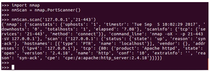 The third line i.e. nmScan.scan('127.0.0.1', '21-443') returns a dictionary of the scan, executed on the local Home(127.0.0.1) network, for port numbers between 21 to 443. You can also provide the IP address of any remote server as well, to scan the available ports.
